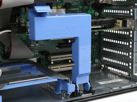 注意观察机箱背面可以发现背面3/4的面板上都设计了散热孔,就连PCI挡板上也设计了密集的散热孔。除此之外,背面提供了两个音频接口、一个RJ-45网络接口、五个USB2.0接口、一个打印机接口、一个串口及两个PS/2接口。